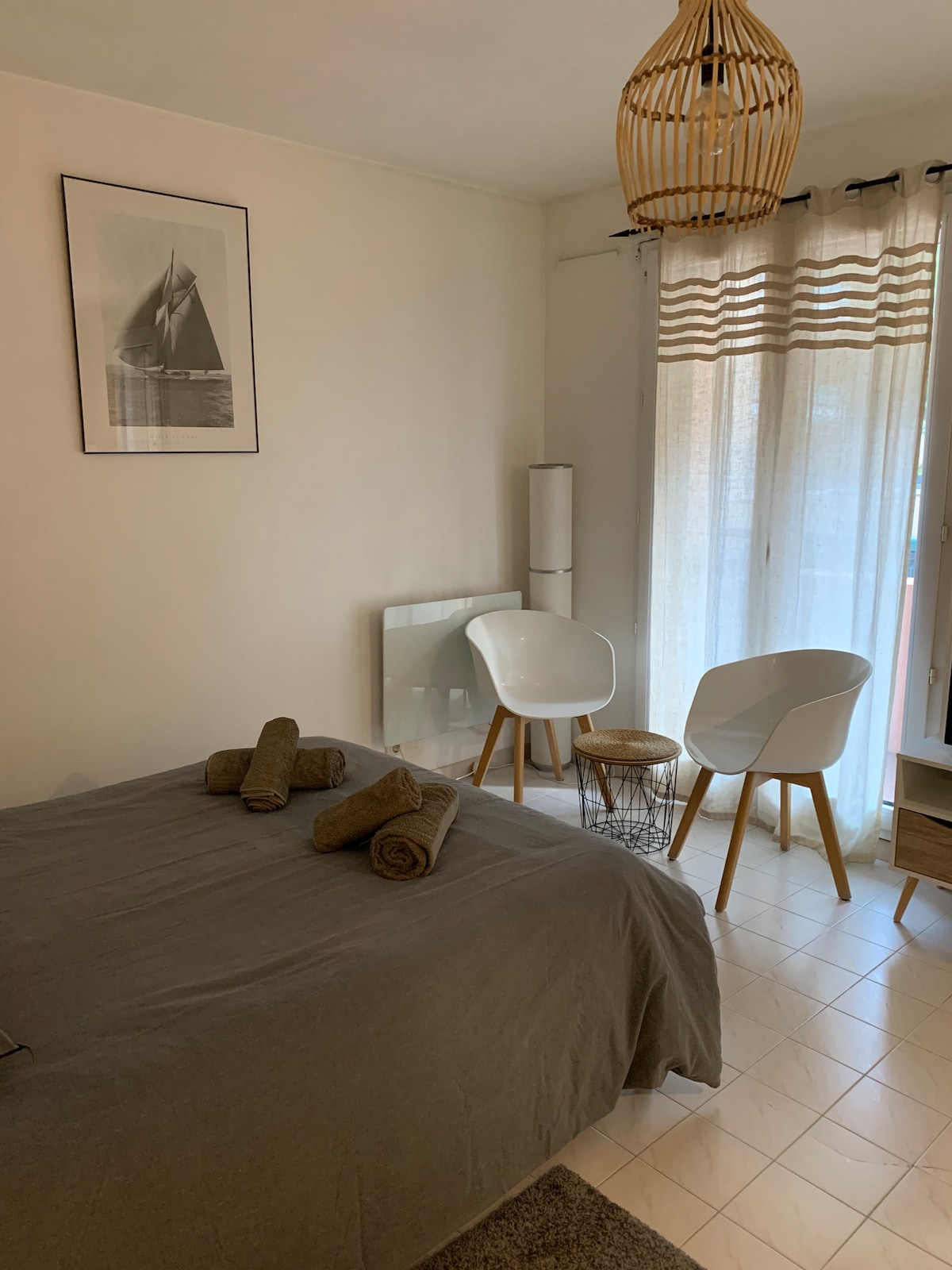 Studio 1 pièce de 28 m2 en RdC, jardin de 30m2 situé dans le centre de Mandelieu avec toutes les commodités, cuisine équipée,cafetière Senseo, cafetière filtre, wifi écran plat tv climatiseur réversible frigo congel four plaque vitro lave linge aspirateur micro onde WC séparés salle bain douche à l'italienne sèche serviettes électrique, appareil eau gazeuse, 1 canapé de 160 X 200 et 1 lit d'appoint relevable de 140 X 200, Draps et serviettes de bain , lits parapluie sur demande, Plancha.