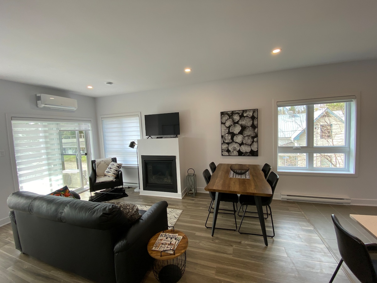 Bienvenue à l’Auberge des Pins! Découvrez un chaleureux loft moderne entièrement équipé, situé à l’étage supérieur de l’auberge. Profitez d’une vue imprenable sur le lac et les montagnes dans un espace à aire ouverte conçu pour le confort et la détente. Vous aurez accès à une plage privée, un balcon privé côté lac, une cuisine complète, la climatisation, un foyer électrique, le wifi, la télé avec câble, une douche parapluie, un BBQ, ainsi que 2 kayaks exclusifs en été.