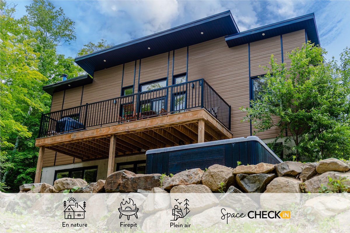 For your vacations choose the Chalet Horizon, an Eden in nature with a view of the mountains ♥ You will appreciate the chalet thanks to: ✷ Semi-private beach 5 minutes away ✷ Large private land, totally surrounded in pure nature ✷ Large bright windows with a view of the horizon ✷ Luxurious and comfortable spaces ✷ Spa open all year round ✷ Terrace equipped with a BBQ and gas fireplace ✷ Smart TV with speakers ✷ Indoor cozy gas fireplace ✷ Foosball table ✷ Wine bar