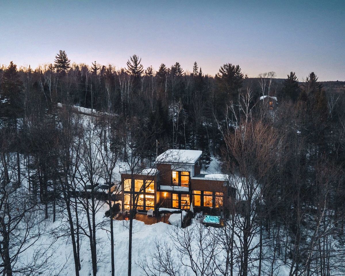 Our Nordic forest chalet is perfect for spending quality time as a couple (or with a kid), or for a work-retreat (with high-speed WiFi). The wooden interior is warm and cozy. The full-height windows offer stunning views over a forested valley. The open-concept kitchen and living room keep you in the conversation while cooking. If you prefer to cook outside, there is a fire pit with a grill and outdoor dining table. Only 70-min drive from Montreal. The lake is a 25-min walk if you park nearby.