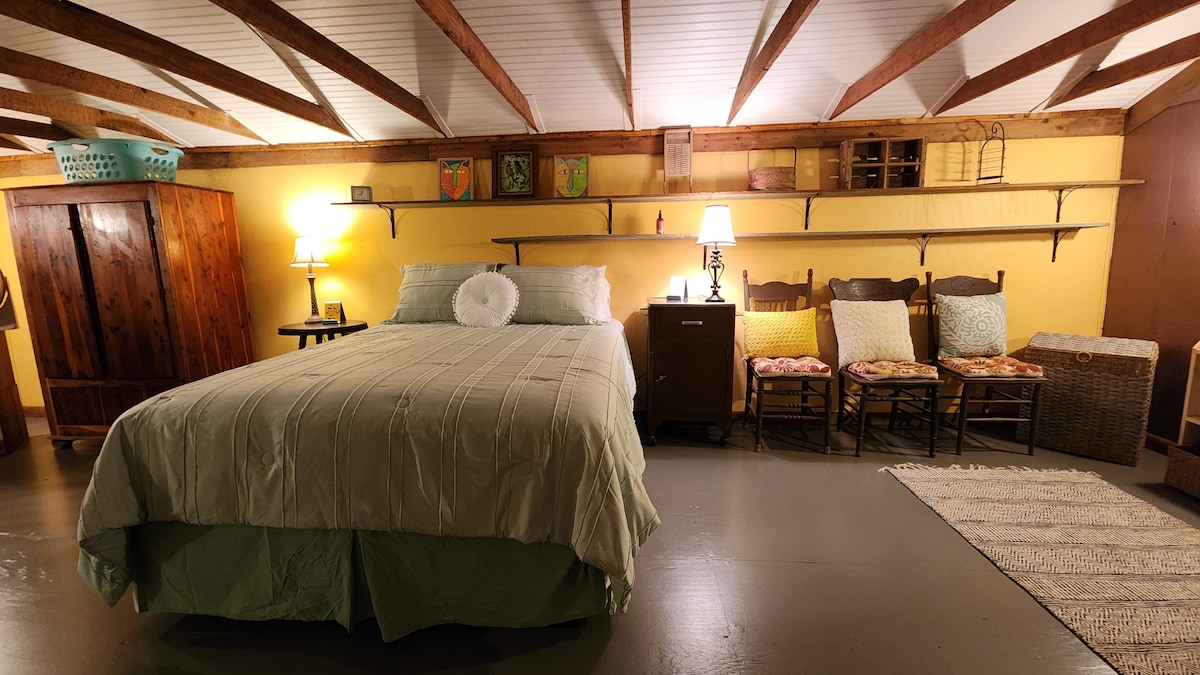 Relax and enjoy the Owls Nest. Less then a mile from the lake, enjoy the restaurants, tail head, and all that Old Mandeville has to offer. Windows on all sides create a warm and comfortable feel. Enjoy the King Bed and newly remodeled Gourmet kitchen. Must be able to climb stairs. The space doesn't share any walls and has its own private entrance.