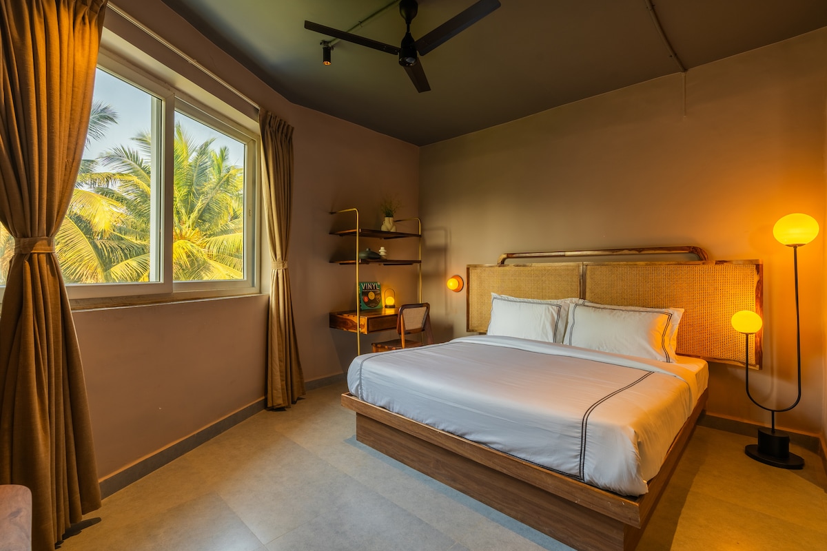🌴 Luxury Wooden Chalet w/ Pool, Jacuzzi&Café – 2 mins from Candolim Beach Far from the noise & close to the waves, our elegant wooden chalet blends rustic charm with modern comforts. Indulge in a private relaxing Jacuzzi experience, enjoy plush bedding, and soak in calm beach vibes. Guests can also unwind at the shared pool, savor fresh bites at the on-site Café, and relax in cozy interiors perfect for couples, solo travelers, or even remote work. 🛁 Jacuzzi|☕ Café| 🏊 Pool|💻Wifi