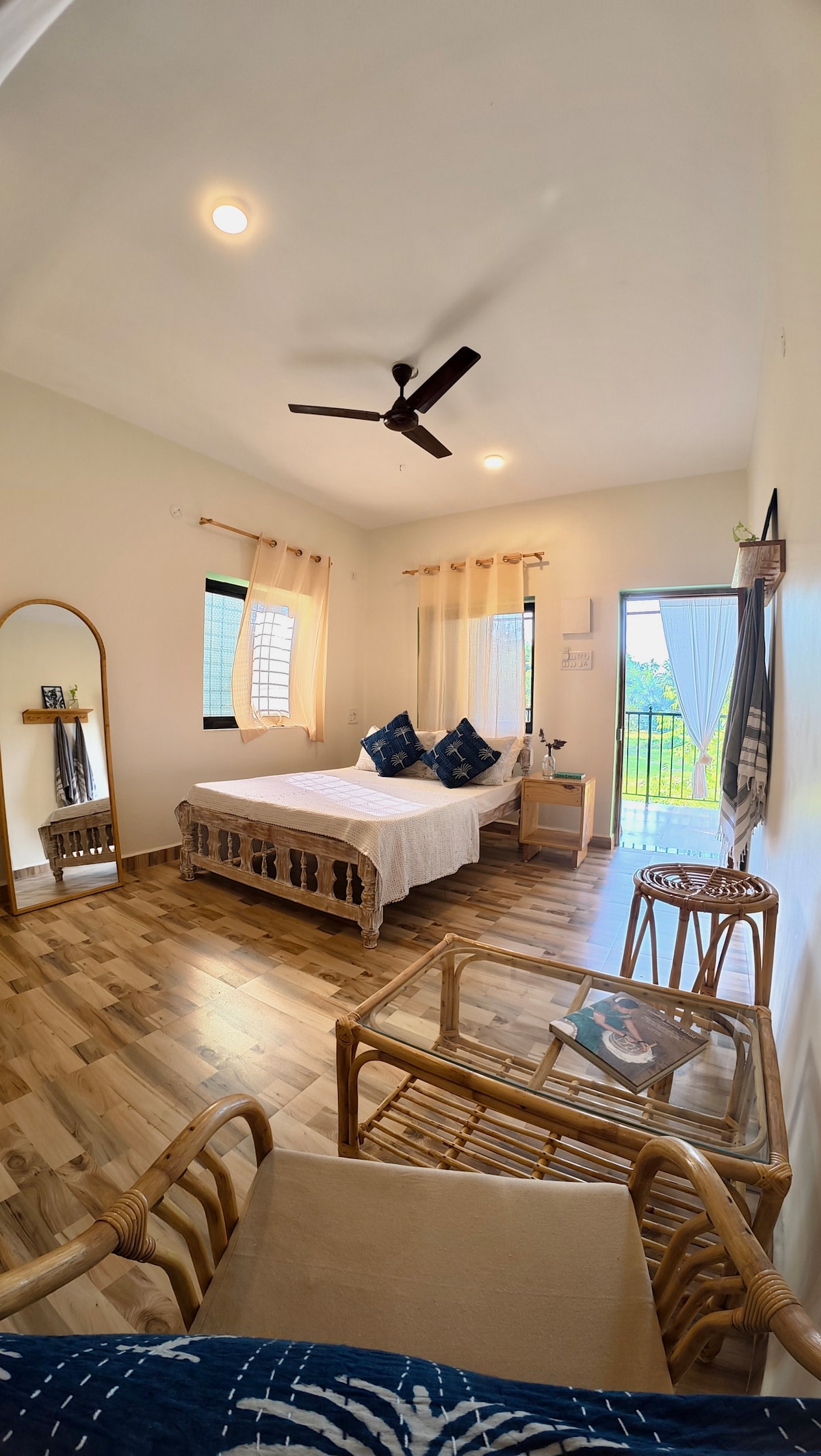 A beautiful boho vibe was front of my mind when creating this stunning cottage. Tucked away in a quite nook, overlooking an organic kitchen garden with the view of the fields, you will be trasported to a bygone era where things were just much slower. When spending time watching the birds & the bees, enjoying leisurely cups of tea, chatting on the balcony was part of the day. Surrounded by trees, you see another side of Goa. Yet you are literally 5 mins away from the party hub of Goa.