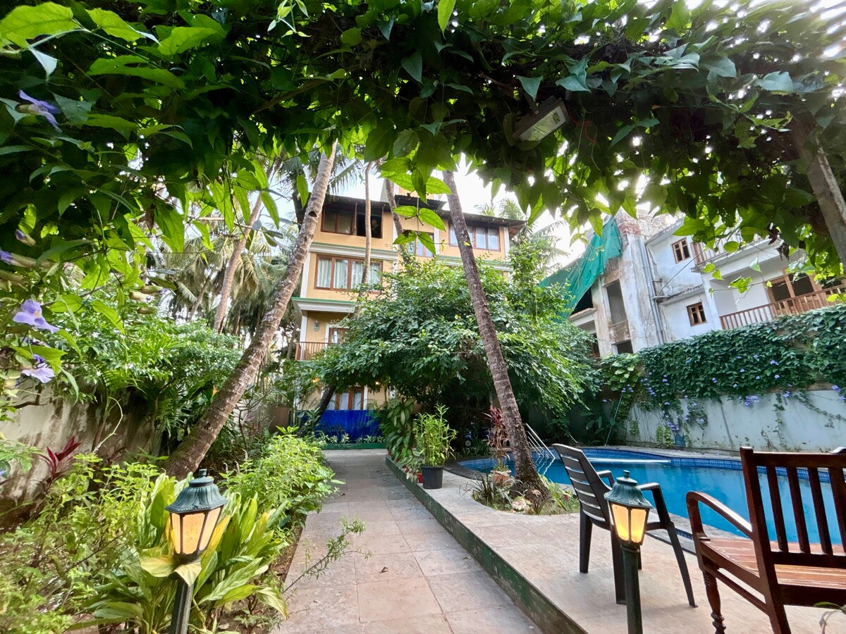 Escape to your private tropical hideaway in the heart of Calangute. Please note: * The plunge pool is fully personal & private, attached to the bedroom with a beautiful view of the Goan palm trees (it’s not a jacuzzi or hot tub). * Guests also have access to a shared rooftop pool (8 am–8 pm), perfect for sunset dips. * Power backup available for lights, fans, Wi-Fi, and charging.