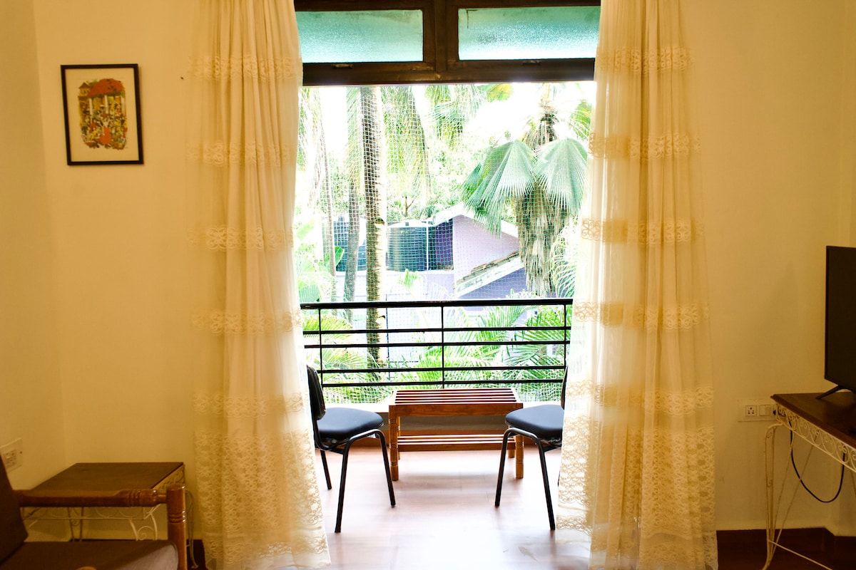 Bright, air-conditioned Verde-Studio at Seven Summers, Mandrem—just a 2-minute walk from Mandrem beach. Enjoy a spacious balcony with lush green views, lots of natural light, free hi-speed WiFi, a fully equipped kitchen, en suite bathroom with hot water, and more. Rooftop access offers sea views. Perfect for solo travelers or couples seeking comfort and a safe environment.