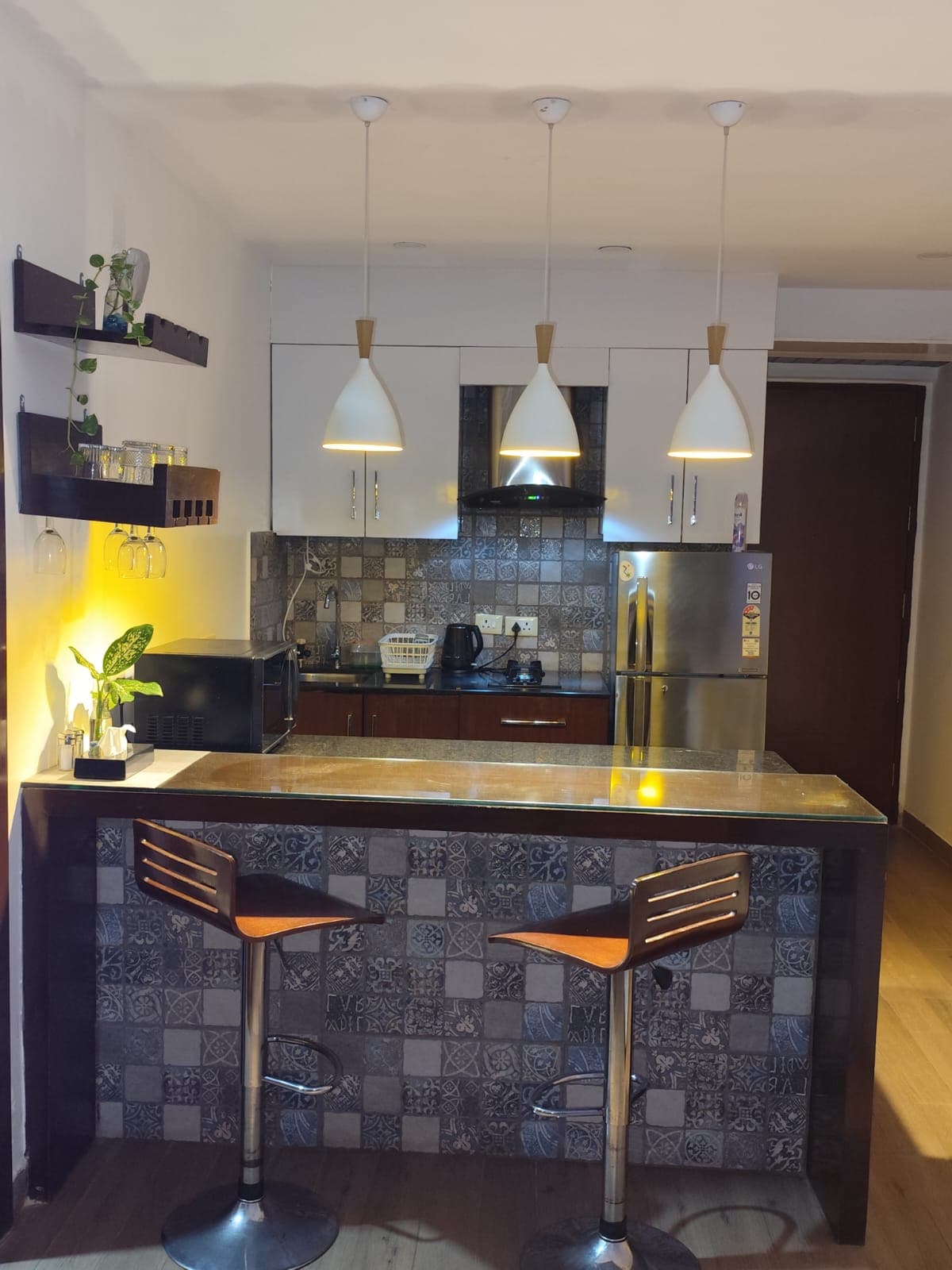 Unwind at our lovingly designed studio apartment with a mezzanine. Our home with high ceiling, floating staircase, hanging plants is designed for a charming feel. Enjoy your coffee with a beautiful view of sunrise over the mountain. The house is located in a residential society, guarded by security 24*7 so you feel safe at our home. We provide our guests with everything from linen, to toileteries, shaving kits, towel slippers, snacks for midnight cravings, and alot more.