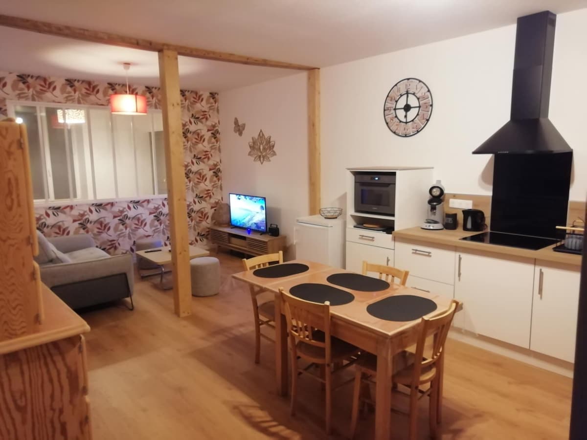 Vous apprécierez ce logement avec une literie confortable et aussi pour son charme. Idéal pour un couple. Muni de TV lecteur DVD. Avec une terrasse privative, deux transats, déserte table et chaises, plancha, fauteuils, parasol. Classé 4 étoiles par syndicat d' initiative local Peignoir de bain à disposition, mais tout est fourni à volonté, linge de maison, linge de table, accessoires de cuisine, nécessaire de toilette, etc NB : Les animaux NON ADMIS