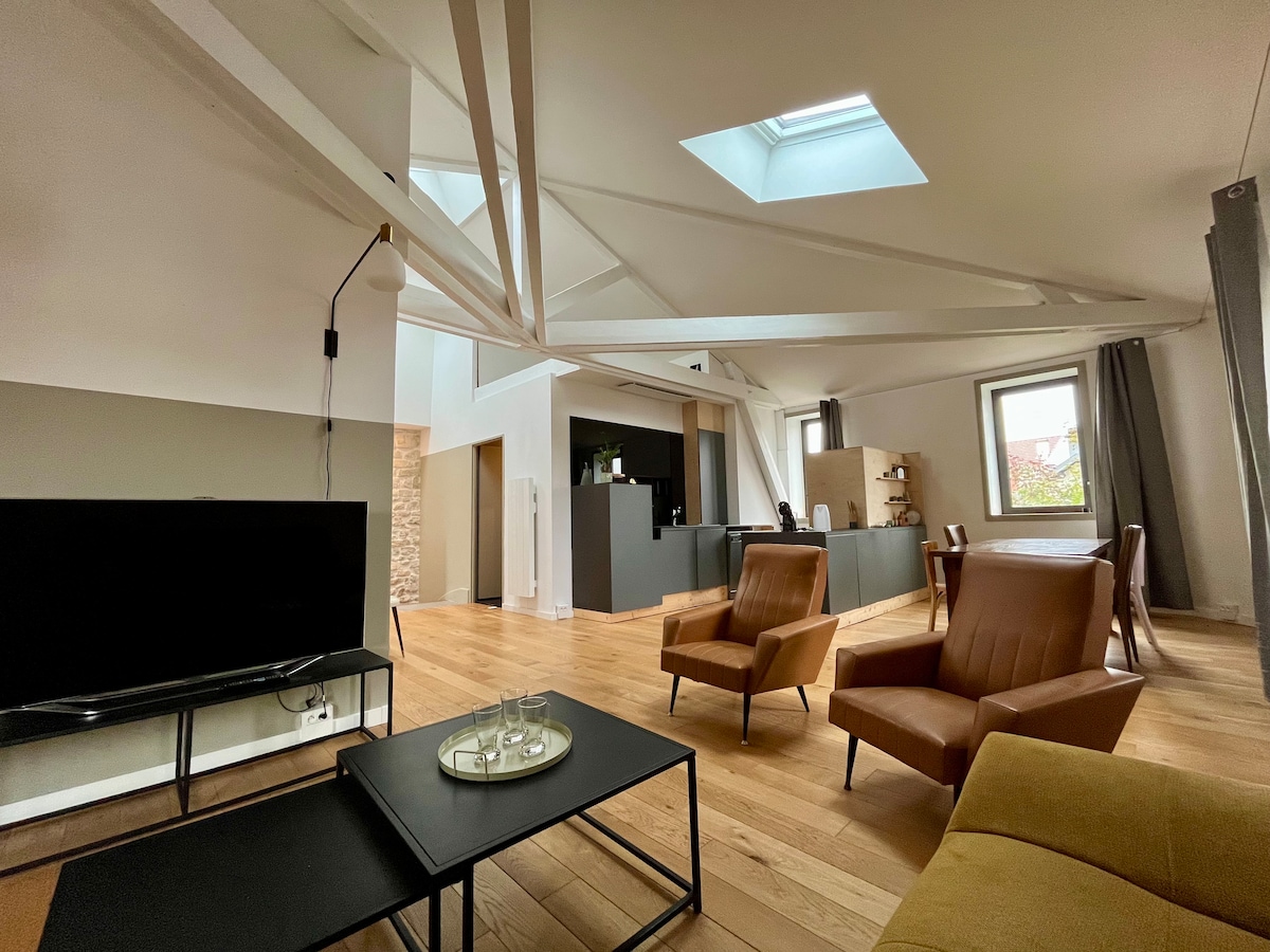 Profitez d'un logement spacieux, élégant et central. Ce très beau loft est au 2ème étage d'un immeuble calme. Très lumineux avec une belle exposition, il possède 3 grands châssis de toiture équipés de volets roulants électriques. Agréable à vivre avec sa belle hauteur sous plafond et charpente apparente. Il est très bien isolé. Proche tous commerces, en plein centre de Vittel. Avec sa déco vintage, élégante, et ses espaces généreux, il est paisible. Vous vous sentirez comme "sur un nuage".