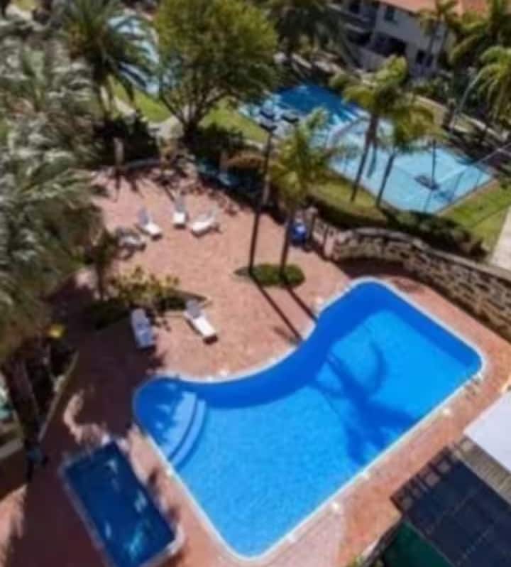 This cozy loft unit is just a stone's throw from the beach—you can even hear the waves! A short walk gets you to the sand, and it’s only a 15–20 minute stroll to Dolphin Quay. Perfect for a short stay, the unit is ideal for families, especially kids who love the unique attic-style loft. There’s plenty to enjoy on-site, including swimming pools, underground trampolines, a hot tub, basketball and tennis courts, a playground, BBQ facilities, and a laundry for convenience.