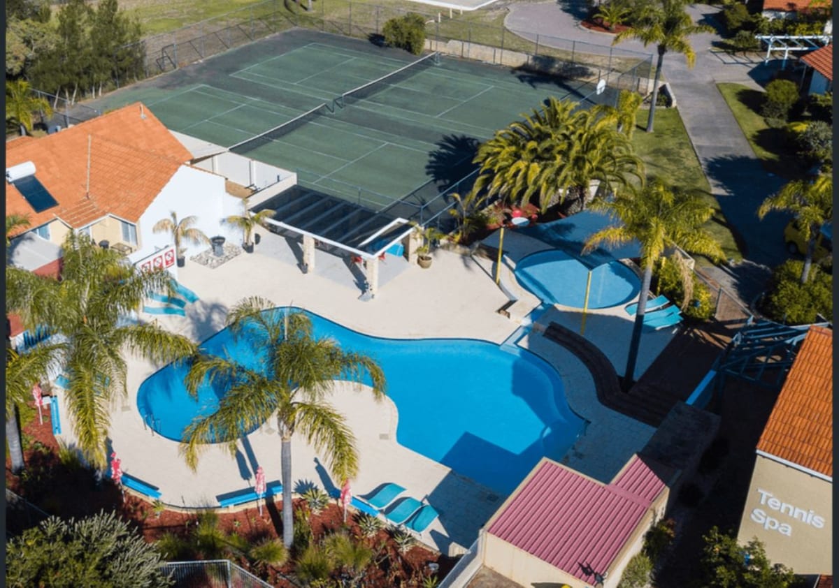 Step into your coastal escape, with private balcony overlooking pool + gardens. Relaxed, comfortable, moments from the beach. • Private balcony w/ pool views, outdoor dining • Sofa bed (Single) • AC • 200m to beach • Walk to Mandurah foreshore • Resort-style pool, gardens • Tennis court • Communal BBQ • Fast WiFi • Kitchenette- mini fridge, kettle, dishes, cutlery, microwave, toaster- unit is not designed for full cooking. • Commercial laundry- washer & dryer • Onsite restaurant • Free parking