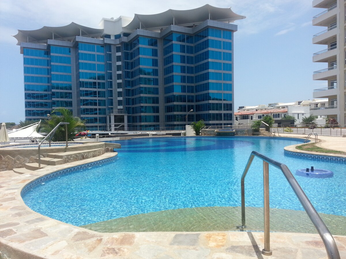 Tendrás agua 24 horas sin problema. Wi fi en todas las áreas de apartamentos y áreas comunes. Agua caliente. 1 puesto de estacionamiento techado. Al llegar al edificio los huéspedes deberán adquirir un brazalete por persona que les incluirá toldos y sillas de playa, uso de gimnasio, canchas de tenis durante su estadía, el costo del mismo es de 20$ por adulto y 10$ menores de 13 años por todo el tiempo del hospedaje.