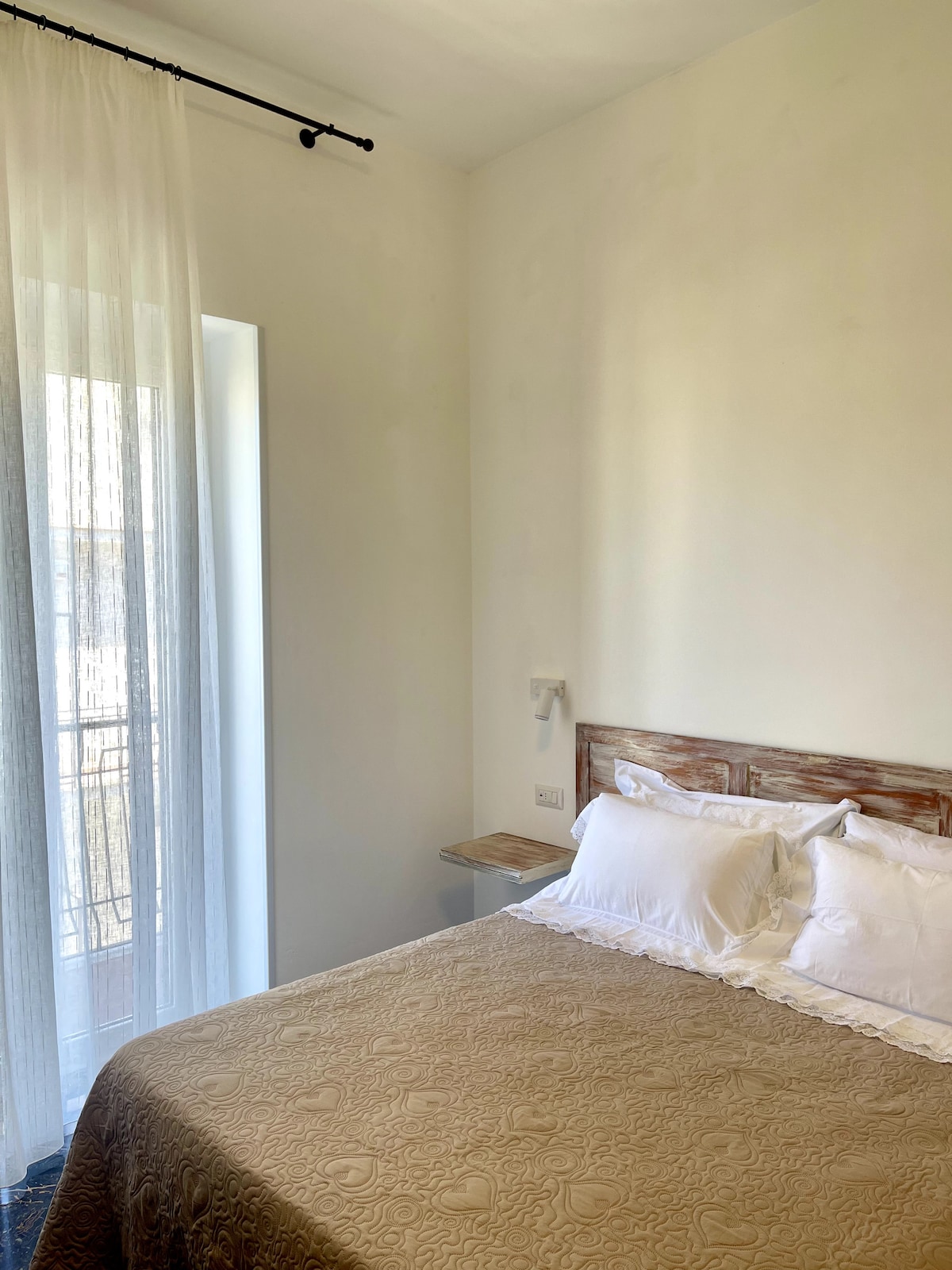 La nostra camera è in stile etnico con un letto matrimoniale in legno naturale così come i comodini, abat jour artigianali e dettagli di arredamento in stile floreale. angolo per prima colazione con macchina per il caffè in camera. l'alloggio è provvisto di bagno in camera e balcone esclusivo privato da cui si accede attraverso porta-finestra doppia camera per un ottimo isolamento acustico e termico.