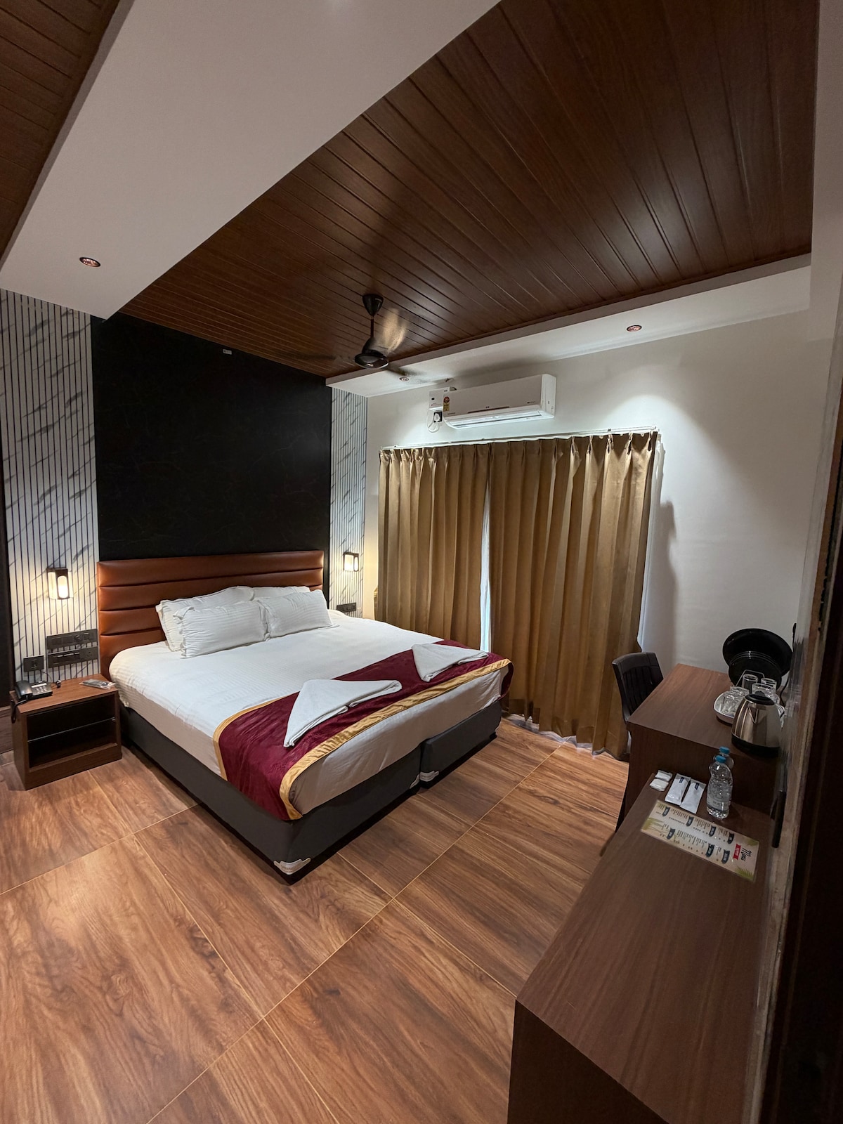 This spacious, elegantly designed room offers a minimalist aesthetic, combining comfort and practicality. The cozy double bed, dressed in crisp white linens with a rich green runner, creates a welcoming space to relax. A sleek wooden wardrobe provides ample storage, ensuring a tidy stay. Soft lighting and neutral tones enhance the room's warm and contemporary appeal, while the cultural artwork adds charm.