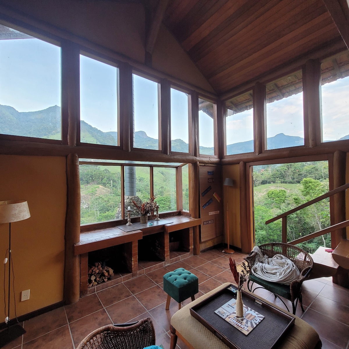 Chalé no alto da morro (já que no Brasil não têm montanha), estrutura de madeira, com mezanino, frente de vidros com visual incrível, lareira para aquecer o friozinho, muita natureza, é perfeito para contemplação da lua e estrelas! Tem 2 quartos com camas de casal e mais 2 colchões de solteiro, todos os espaços no Interior são abertos. É isolado, minha casa fica na propriedade, mas distante uns 80 metros, quem aluga não divide o espaço com outros hóspedes.