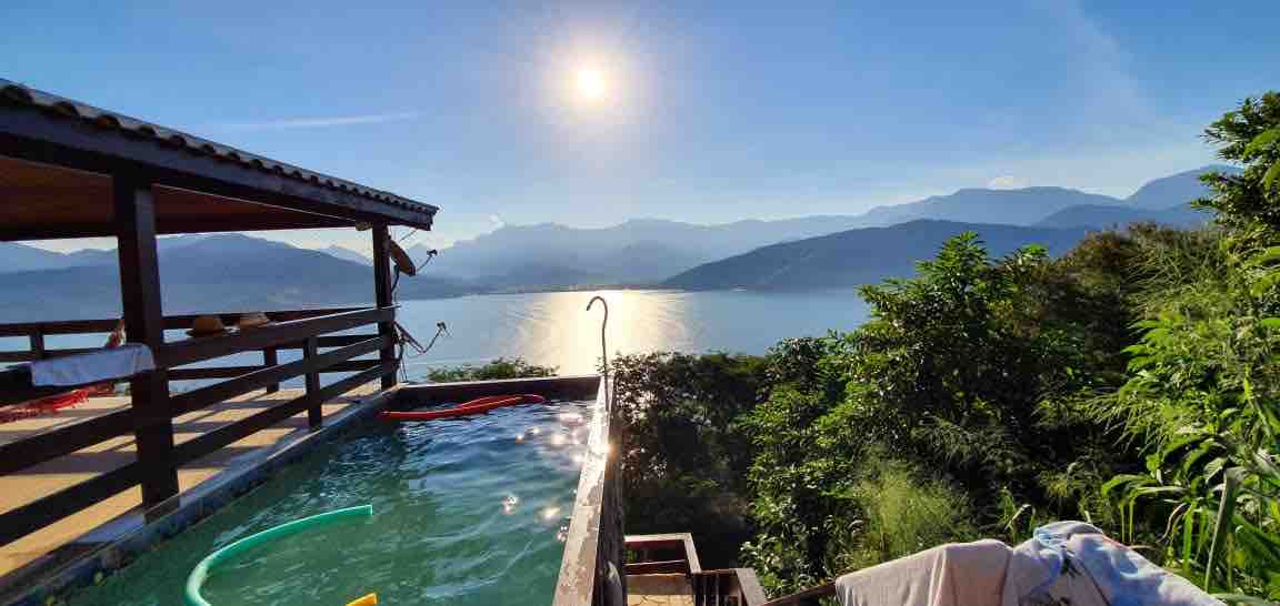 Vista total para o mar e para as montanhas /luz do luar e o sol são os donos do local ;uma piscina com borda infinita que da vista para o mar e as montanhas da costa verde.uma banheira de hidro no dekc de madeira totalmente ao ar livre .