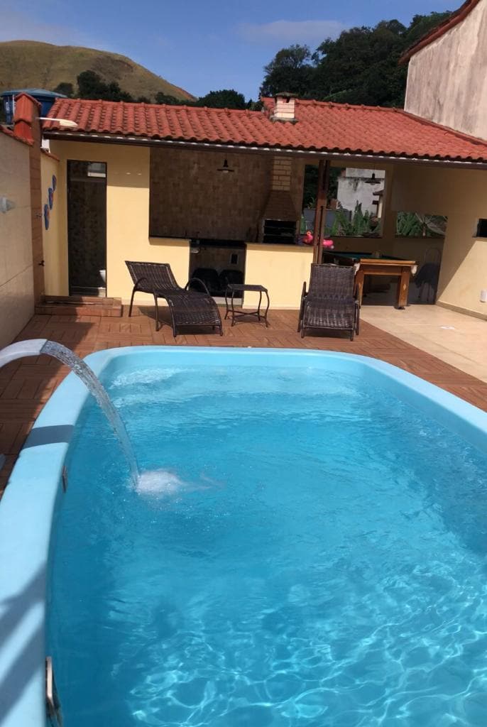 Casa com 3 quartos, piscina, área gourmet e terraço! Sao 3 andares para desfrutar. Espaço fica na rua atrás da orla. Bem cêntrico e a minutos caminhando para pegar táxi boats agendados, que levam a lindas ilhas da Costa verde. A 2km da saída da barca oficial p/ ilha grande. Tbm Cachoeiras próximas. Casa completa, reformada. Terraço com uma vista bonita! Casa de fundos, privada. É uma ruazinha sem saída bem tranquila. Não tem garagem, mas pode estacionar na rua em frente facilmente.