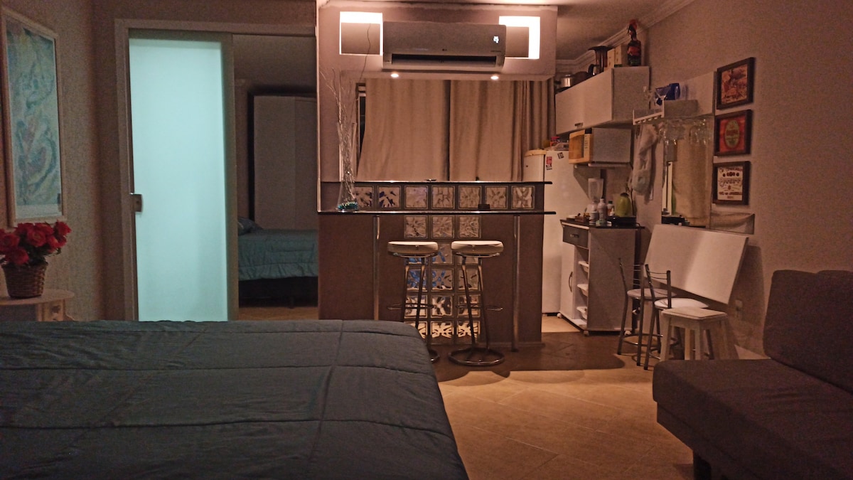 Reconecte-se a quem você mais ama neste lugar lindo ideal para famílias. Com cama queen e sofá cama de casal. Ambiente agradável, seguro, com acesso a piscina, restaurante no hotel, salão de jogos e academia. É um espaço pequeno, mas bem aconchegante! Temos geladeira, micro-ondas, sanduicheira e cafeteira.