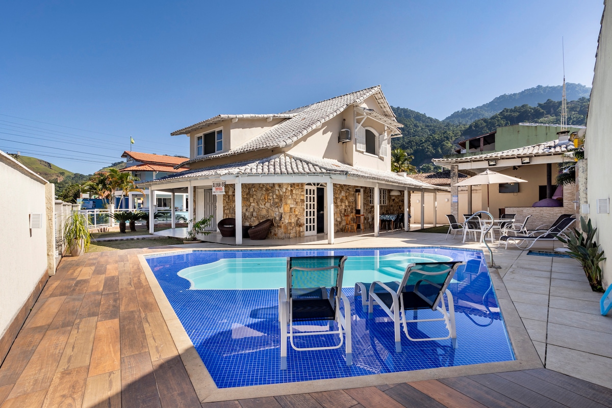 LINDA CASA DE PEDRA para 9 pessoas, em Mangaratiba, em condomínio fechado (cond. Guity). Cachoeira privada com churrasqueira coberta ao lado e um espaço para fogueira.Vista total para o mar e a 50 metros de distância de uma praia com águas calmas, exclusiva do condomínio, ideal para crianças e idosos e para a prática de esportes como natação, stand up paddle e caiaque*. A casa tem 3 quartos com ar condicionado, 3 banheiros, sala ampla e varanda. Internet super rápida: 500MG *aluguel disponível