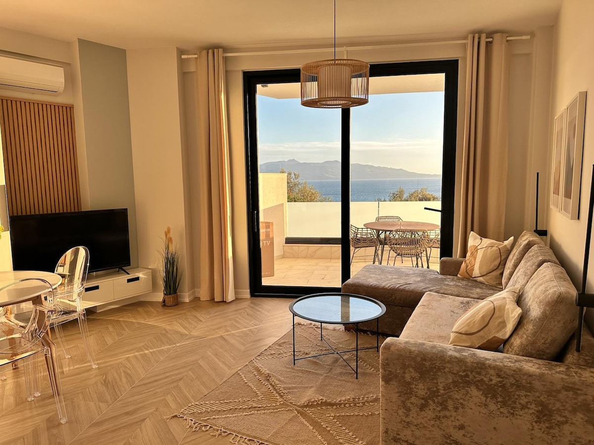 Imagine waking to the Ionian Sea's sound, or enjoying wine on the balcony at sunset with a private beach 1-min away downstairs. This lovely coastal apartment at Bougainville Bay has it all. The interior is bright and spacious, with floor-to-ceiling windows showcasing sea views. The apartment is designed by the Architect of our family, our mom, who's catered her design to intertwine with the bougainvillaea flowers and the hills of the olive groves in the city of Sarandë.