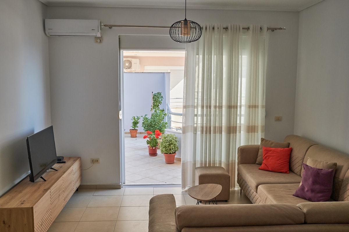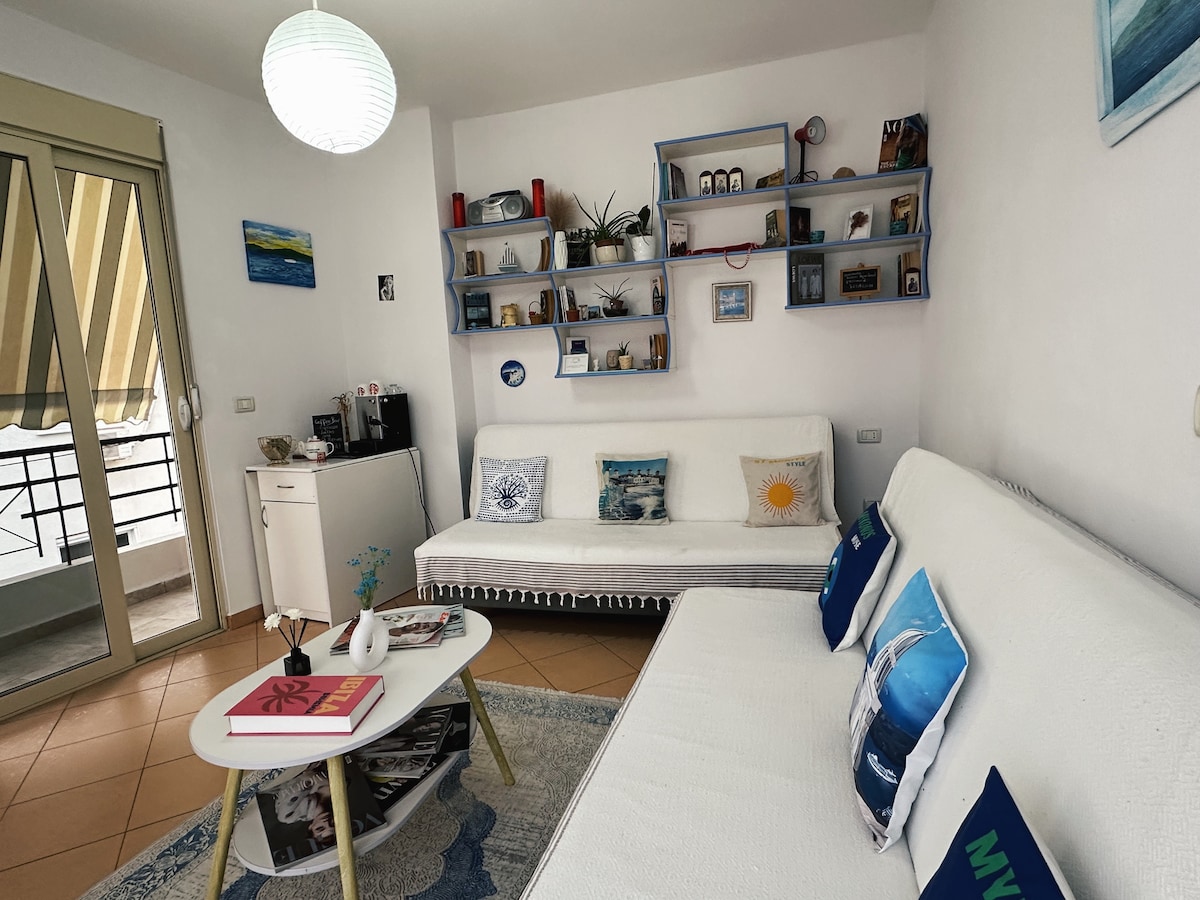 Beautiful one bedroom apartment with a big Living room and kitchen in the center of Sarande. Lately renovated with modern furniture and appliances. Beautiful view of the city during day and night. 3 mins away from the beach and the pedestrian walk. Very close to the grocery stores and cloth boutiques. (Note: The building has no functional elevator so be prepared to climb stairs)