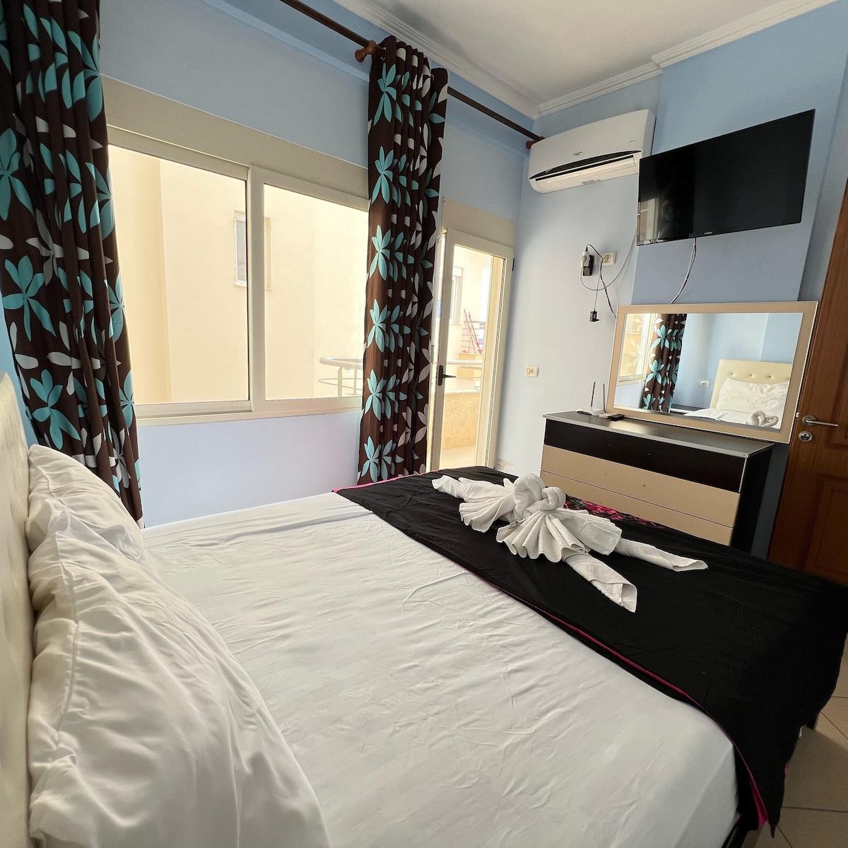 Attraktivt belägen lägenhet i "Horizon Residence". Fin utsikt i ett mycket lugnt område och strandnära. Perfekt för par eller familjer som vill koppla av och njuta av Saranda under alla årstider. Lägenheten har spis, airfryer, frys, kylskåp och bra köksutrustning för frukost och lättare matlagning. Sovrum med dubbelsäng. Bäddsoffa lämplig för 2 personer. Närhet till en bra supermarket och ett flertal bra restauranger. Långtidsuthyrning. Trivsam lägenhet lätt att gilla!
