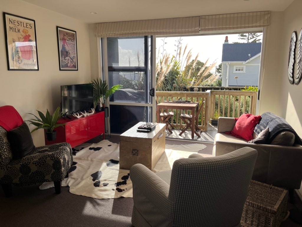 A semi-detached 2 bedroom apartment overlooking park like surroundings & view of Oakura Beach & the Tasman Sea. A very short walk will have the sand between your toes and/or a dip in the sea. Entry into the apartment is via your own front door with an outside lock-box holding the key. The apartment has 2 good size bedrooms, both with wardrobes for storage. Bath robes are supplied for up to 4 guests. In the well appointed lounge/dining room area you will also find a TV, CD player & FM radio.
