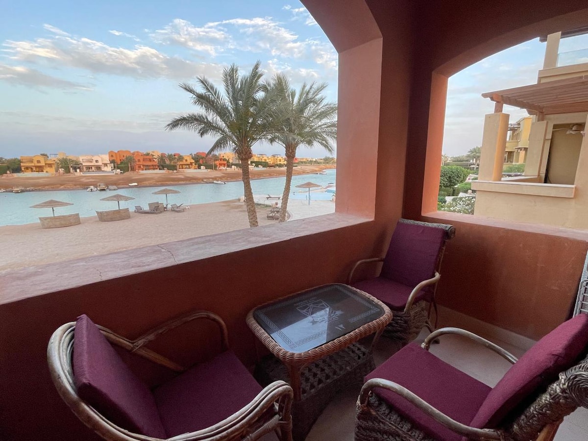 Experience the best of El Gouna with this stunning beachfront apartment. 🌟Everything you need is within walking distance—supermarkets, restaurants, and more! 🏖 Enjoy direct access to Mangroovy Beach, along with its variety of dining options. 🚗 Free parking within the gated compound. 🏄‍♂️ Kitesurfing center at Mangroovy Beach – Learn or ride with your own gear! Per local regulation, mixed-gender of Egyptian citizens are not permitted.
