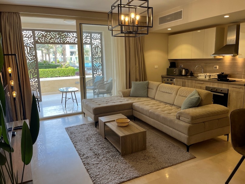 Stylish 2-bedroom apartment in the heart of El Gouna. The beautiful pool is located directly within the complex, just steps away, and the private beach and lagoon are only an 6-minute walk. Perfect for a relaxed stay with family, friends or as a couple. *The space* 2 bedrooms 2 bathrooms Private balcony Fully equipped kitchen A/C in all rooms De’Longhi espresso machine Washing machine Fast Wi-Fi Safe Smart TV with streaming options Close to Marina, Downtown & Kafr Quiet and green surroundings