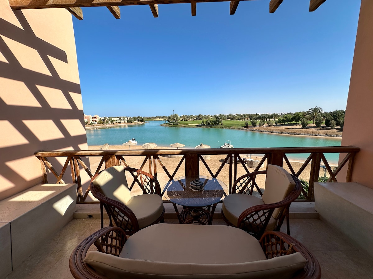 Cozy Two-bedroom apartment on the second floor offers a marvelous view of the largest sea lagoon in El Gouna, complete with a beautiful landscape and Golf courses . Both the lagoon and the Golf are conveniently accessible. Additionally, you can enjoy a completely private stay on the balcony! The apartment is located in 'Golf Steigenberger' neighborhood, close to the lively Downtown area 3 Min and Abu Tig Marina 5 Min , yet far enough from the crowd and noise.