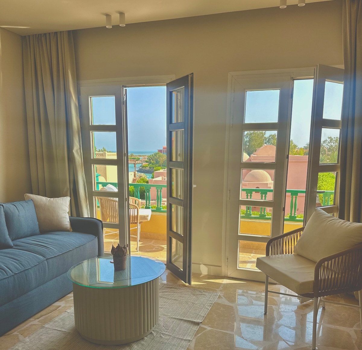 A calm, design-led apartment overlooking a lagoon-style pool, with clean lines, natural materials, and a light, uncluttered feel. Created for guests who value privacy, comfort, and a slower El Gouna rhythm. Thoughtfully styled interiors open directly onto the water, making mornings easy and evenings quiet. Ideal for couples or solo stays who want a peaceful base close to everything, without the noise. Best suited for relaxed stays, remote work, or longer escapes rather than party weekends.