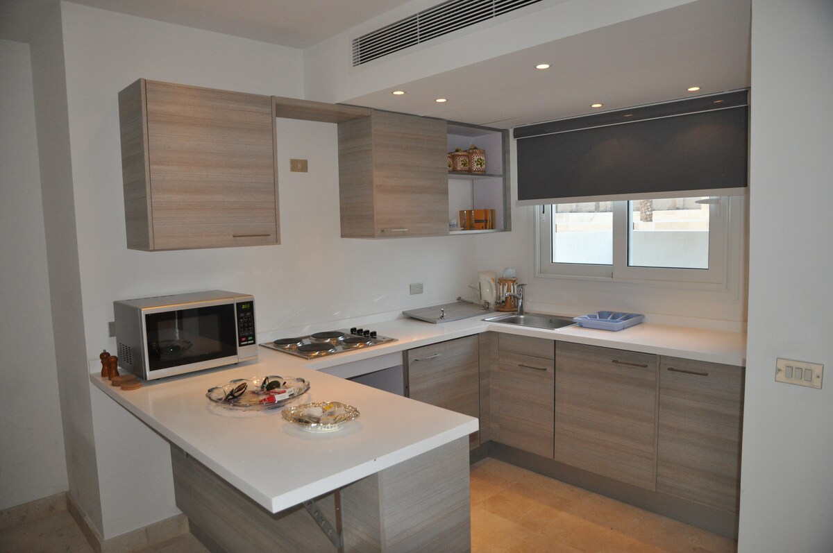 Cozy comfortable one bed room apartment with an exclusive one floor concept makes you in a private home no one above you and no one under you, where u can enjoy your private 3mx3m heated jacuzzi, fenced terrace, parking, and beyond the privacy of your home you will enjoy a secured and gated Bali Compound with its breathtaking architecture and zen gardens,witch make it suitable for couples, small family or honeymooners.