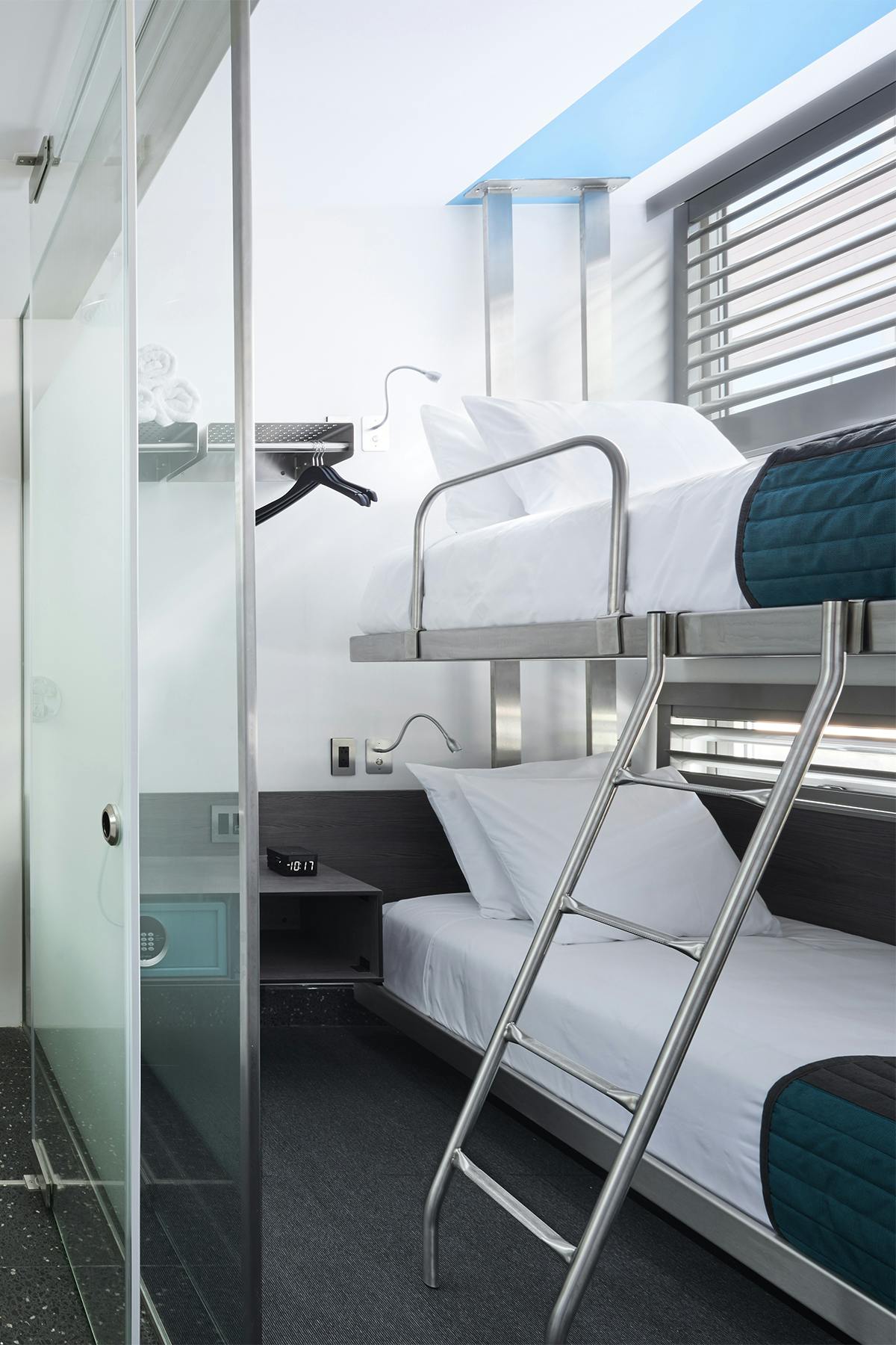 Stay in our 110 sq. ft. Bunk Pod room with two comfy twin beds, each with its own flat-screen TV. Enjoy modern amenities like air conditioning, a work desk, rainfall shower, and free local calls. All Pods are fully private with en suite bathrooms and entertainment-ready features. Designed for efficiency and fun, nightly rates cover the entire room for up to two guests.