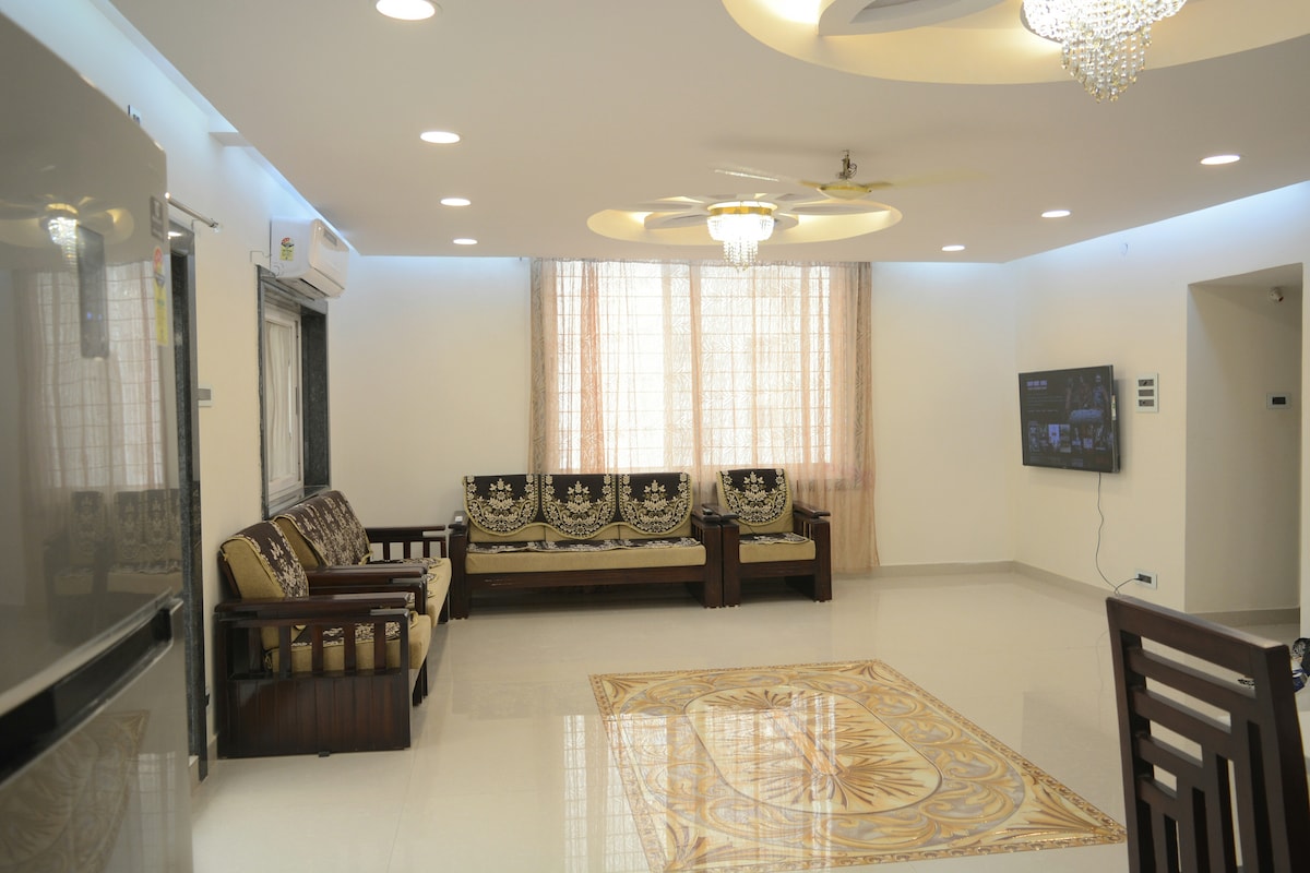 Welcome to your ideal home away from home. Our apartment is on the first floor of the villa without a lift, exclusively for the families only. Unmarried couples and Bachelors are restricted. Our apartment is spacious. A/C in both the bedrooms, with attached bathrooms. Featuring two spacious bedrooms, our retreat ensures a peaceful night's sleep . The master bedroom is with a king-size bed, while the second bedroom is with 2 Single beds, and two additional floor mattresses.