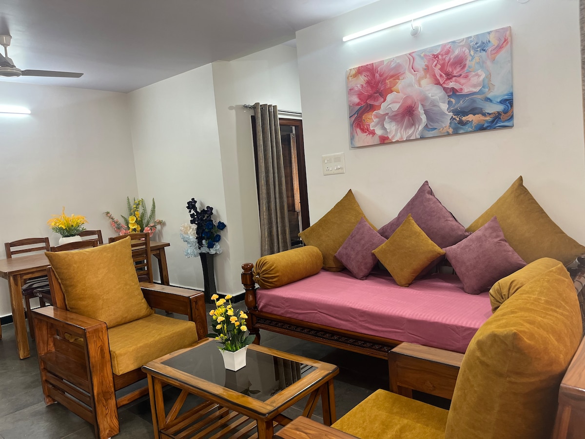 Butterfly room in 3bhk flat with attached washroom. Your family will be close to everything when you stay at this centrally-located place. Ground floor with garden around keeps the place cool. Amenities: Wi-Fi 7x7 mattress Sofa Dining table Fridge Washing machine (200/- extra per usage to cover current bill) Gym Children’s park Swimming pool Table tennis court Basketball Court Pool table AC is charged 200/- extra per day