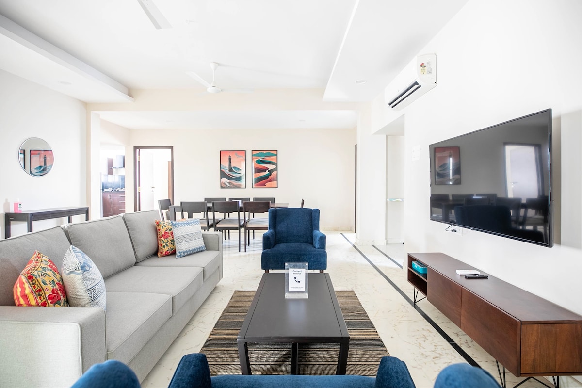Welcome to our luxurious 4-bedroom haven nestled on a vibrant city boulevard. Enclave Vista at Banjara Hills is located in one of the most affluent neighbourhoods, home to some of the city's high-end restaurants, retail malls, medical & educational insitutions and green spaces. Perfect for families, group of friends, business travellers, or those seeking a refreshing work-from-home environment, we offer complimentary high-speed WiFi.
