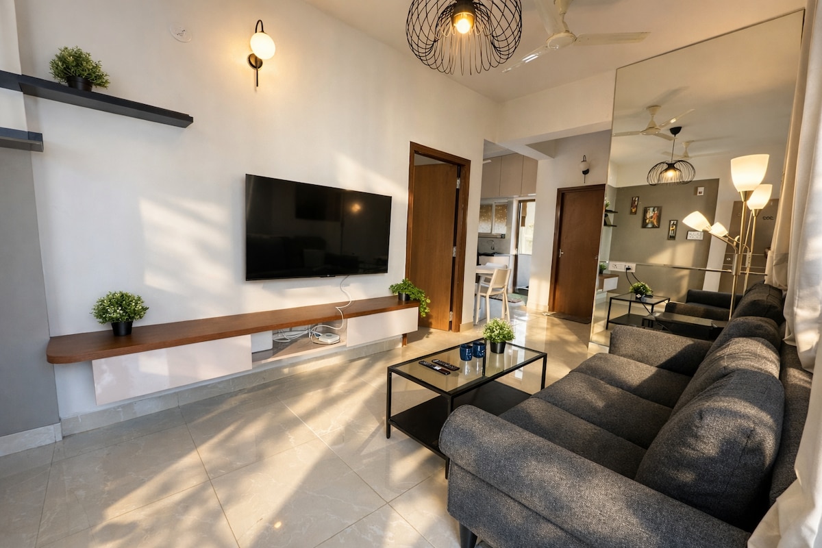 Welcome to our fully air-conditioned 2-bedroom apartment located right on Manikonda Main Road — a prime, safe, and convenient location in Hyderabad. Beat the heat with powerful ACs in both bedrooms and two in the spacious living room, keeping the entire home refreshingly cool. Enjoy a comfy stay with a cozy sofa, quality beds, a 65-inch TV with high-speed Wi-Fi, a big two-door fridge, and a well-equipped kitchen and dining area.