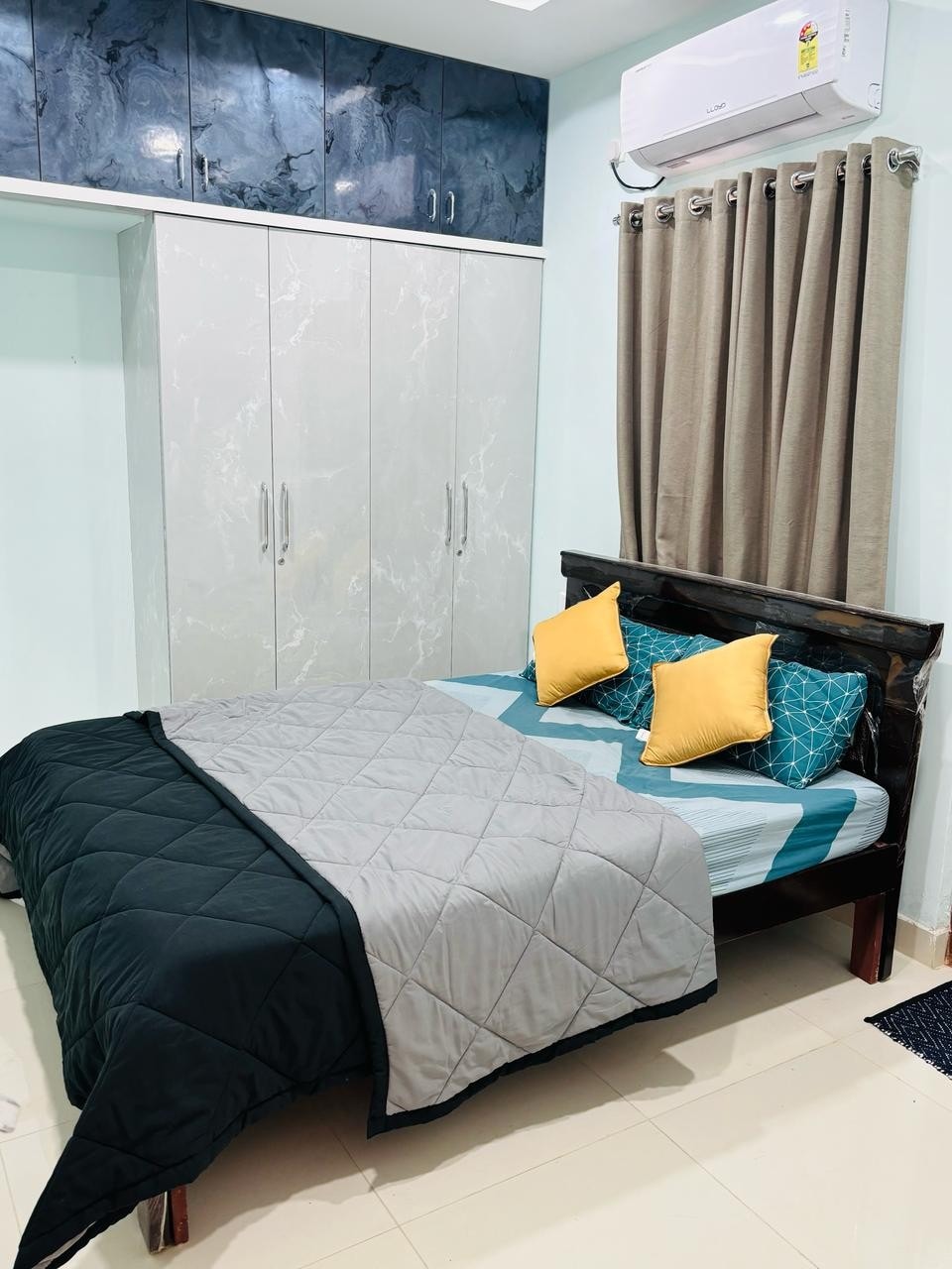 Welcome to our fully air-conditioned 2-bedroom apartment located right on Manikonda Main Road — a prime, safe, and convenient location in Hyderabad. Beat the heat with powerful ACs in both bedrooms and two in the spacious living room, keeping the entire home refreshingly cool. Enjoy a comfy stay with a cozy sofa, quality beds, a 65-inch TV with high-speed Wi-Fi, a big two-door fridge, and a well-equipped kitchen and dining area.