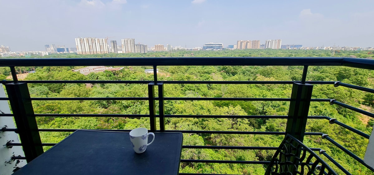 This cozy studio/1-bedroom apt on 5th FL is perfect for a single traveler or a couple. 2+1 can be accommodated too if privacy is not of concern. This new construction has ample ventilation with balcony exposed to the Botanical Garden that offers a much needed green space in Gachibowli and Kondapur. You live right next to nature, a 275 acre green space in the middle of IT zone in a peaceful quiet environment yet close enough to the urban spaces like cafes, bars, clubs if that's your scene.