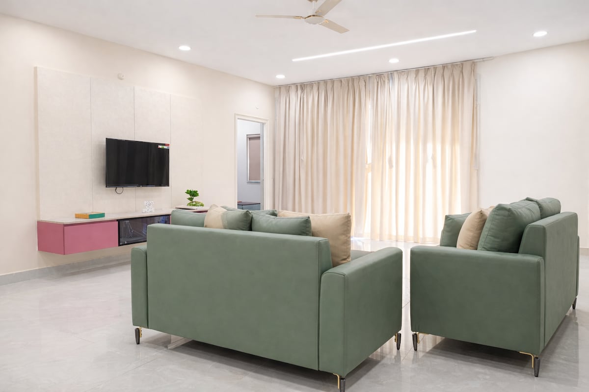 Welcome to our fully air-conditioned 2-bedroom apartment located right on Manikonda Main Road — a prime, safe, and convenient location in Hyderabad. Beat the heat with powerful ACs in both bedrooms and two in the spacious living room, keeping the entire home refreshingly cool. Enjoy a comfy stay with a cozy sofa, quality beds, a 65-inch TV with high-speed Wi-Fi, a big two-door fridge, and a well-equipped kitchen and dining area.