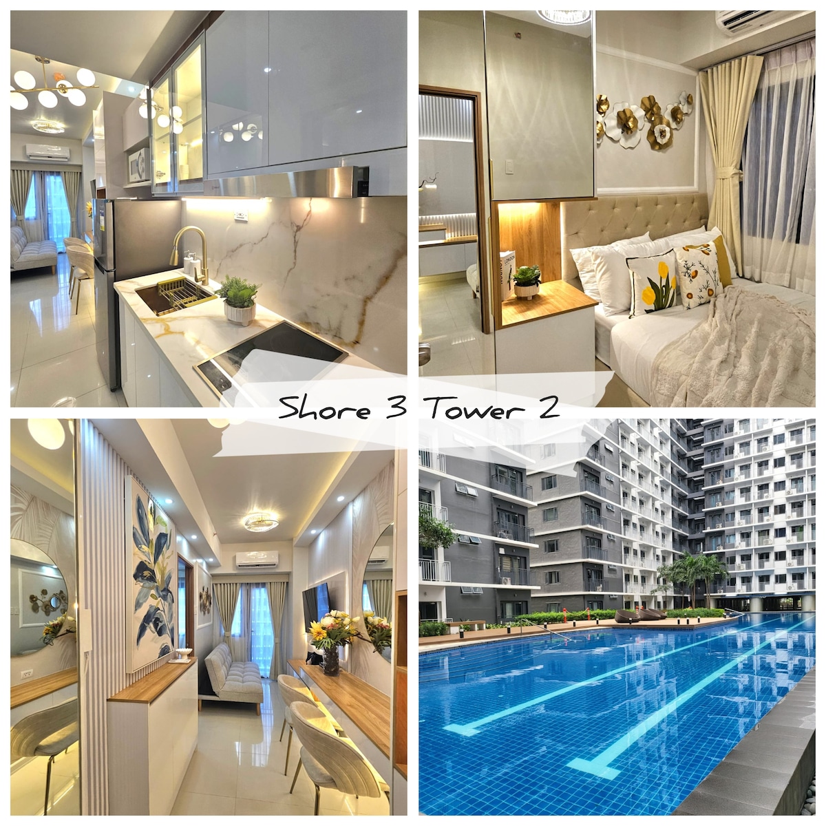 Welcome to this simple yet elegant Muji-inspired condo unit situated in 3rd Floor of Shore 2 Residences Tower 2 in Pasay City which offers a cozy ambiance with a stunning pool view and green scenery of SMDC landscapes , providing guests with a serene and rejuvenating place to stay. - Walking distance to MOA & Manila Bay - Surrounded by Starbucks, Watsons, AlfaMart and other convenient stores for your necessities - Near NAIA - Implements strong security measures for your safety