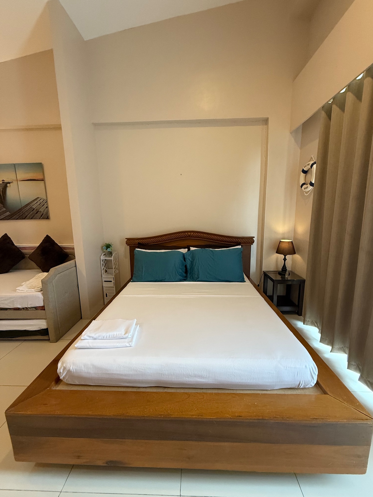 Relax in our spacious room with a clean, minimalist design — thoughtfully styled to give you comfort and peace of mind. Enjoy your morning coffee or unwind at sunset with a beautiful overlooking view right from the room. Pool Access Entrance fee: 100 pesos per head 8am to 9pm Closed every monday for cleaning