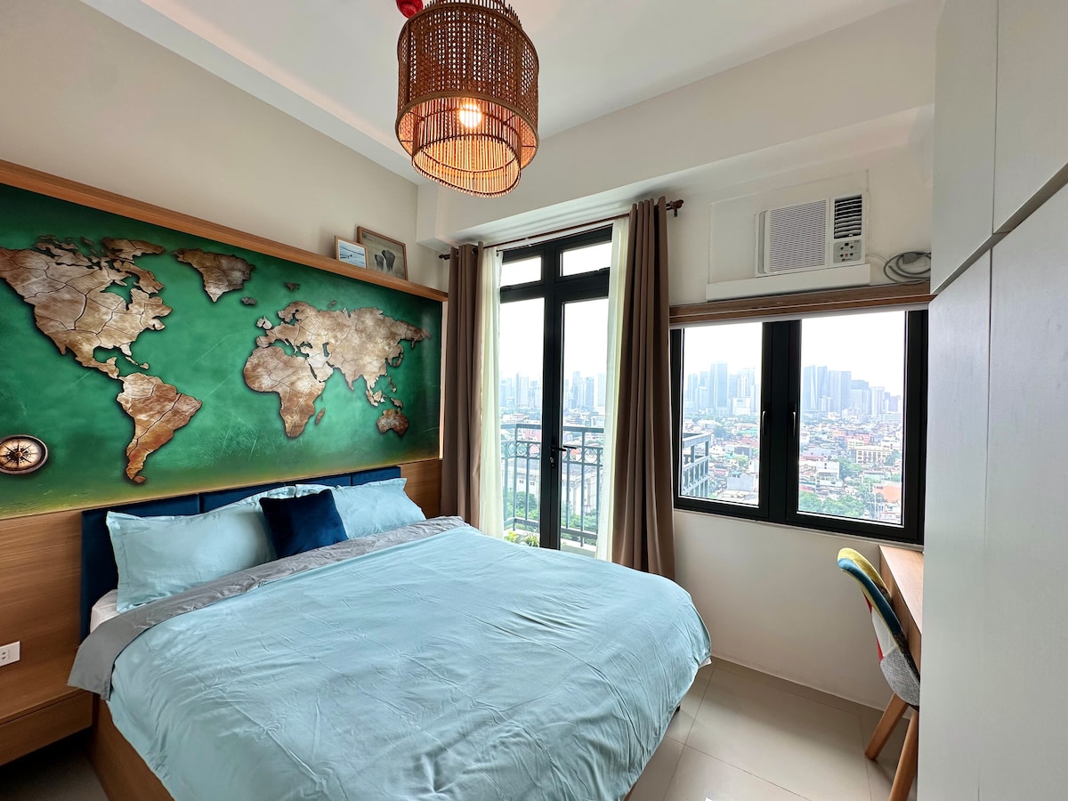 Wake up with the tropical palms as ur view from ur bed thru glass door. It has Queen bed & hotel quality ortho mattress, pillows and linen for luxury sleeping experience. Equipped with your basic kitchenette needs. 800m from Mall of Asia, 20 mins from airport, Theatres, Esplanade, With alfamart, Starbucks & restaurants at the ground. Pool is accessible for a fee. Jump off straight from your balcony to the pool after pre registration and easily access back your unit by dedicated step.