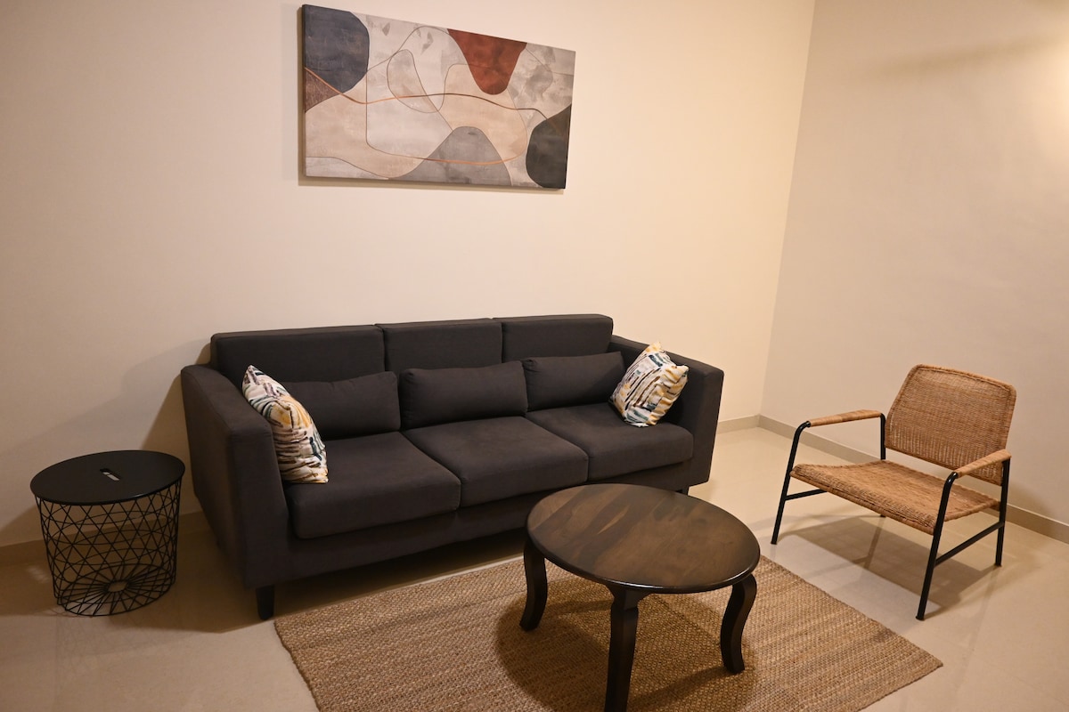 Welcome to your peaceful retreat! This spacious Villa features a comfortable queen bed and an extra single mattress. Stay cool with air conditioning, and enjoy entertainment with Smart TV. Step out onto your private balcony to relax. The Villa includes a fully-equipped kitchen with a gas stove, utensils, a water purifier and a fridge, ideal for preparing your own meals. You’ll have a cozy living and dining area to unwind in comfort. Enjoy the convenience of free parking and complete privacy.