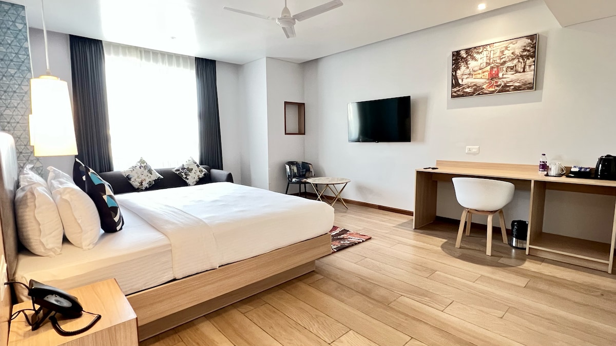 Stylish and Hip boutique hotel in the heart of Imphal. Stay here for a comfortable stay and easy access to all business and leisure requirements. This Executive Bedroom has a king bed, sofa, writing desk, kettle, wardrobe and an en suite bathroom.