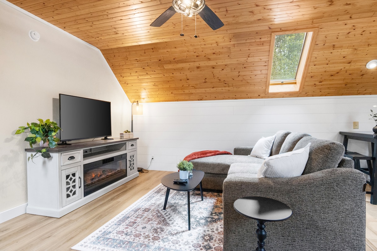 Nestled on the Betsie River near Crystal Mountain, this romantic A-Frame offers a private hot tub under starry skies, a glowing indoor fireplace, and a loft bedroom overlooking the river. Sip local coffee from the espresso bar, fish from the riverbank, or unwind by the firepit. Designed for couples yet comfortable for small families seeking a peaceful riverfront escape. Weekend dates go fast — book early to secure your stay.