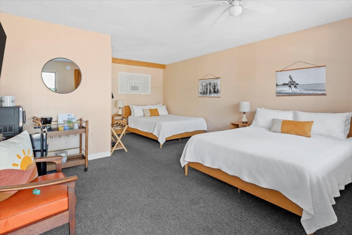 Enjoy a relaxing stay in this comfortable room at Pleasant Valley Resort, featuring two double beds and a private bath. Stay cool with air-conditioning and a ceiling fan, and keep entertained with cable TV and free WiFi. A cozy seating area is perfect for unwinding after a day of exploring. For added convenience, the room includes a refrigerator, microwave, and coffee maker—everything you need for a restful and hassle-free getaway.