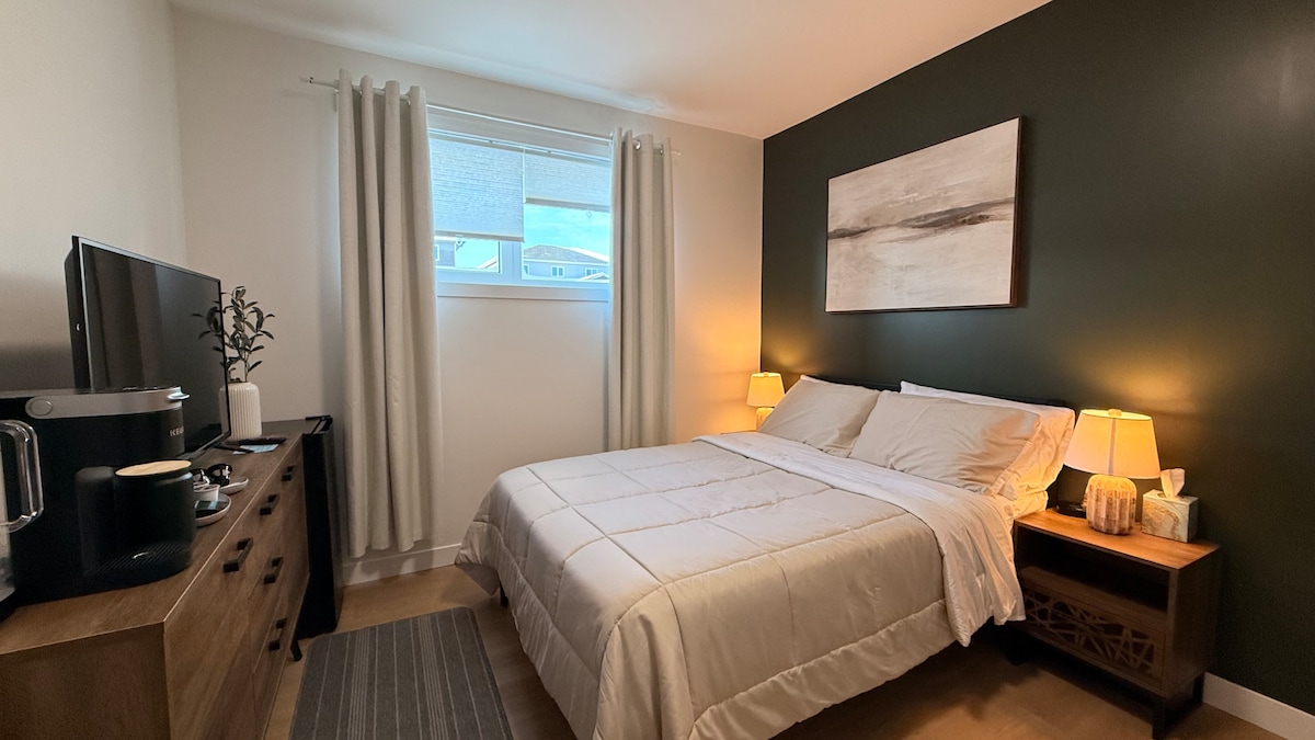 Small but mighty, this compact Winkler suite offers style, convenience and the perfect balance for your stay. This cozy studio is thoughtfully designed to offer everything you need for a relaxing stay, all within a clean, modern, and intelligently organized layout. What You’ll Love: ✔ Private entrance, self-contained suite — no shared living spaces ✔ 3-Piece Bath ✔ Fully Equipped Kitchenette ✔ Mini Fridge/freezer ✔ Double-Size Bed ✔ Smart TV ✔ Modern Lighting & Clean Design ✔ Convenient Location