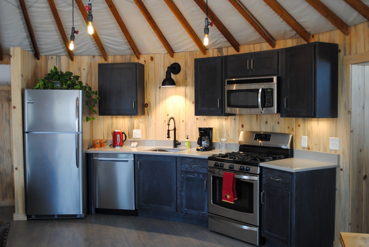 Relax in the round in a luxurious yurt in the heart of historic Manitou Springs, Colorado. Come home from hiking, exploring, or sightseeing to a king-sized bed, completely outfitted kitchen, and spa-like bathroom complete with a soaking tub and spacious walk-in shower. Manitou Springs is just a short walk or drive down the mountain and Colorado Springs is a 10 minute drive away. Restaurants and shops within walking distance of your own private space--so relaxing, you'll never want to leave!