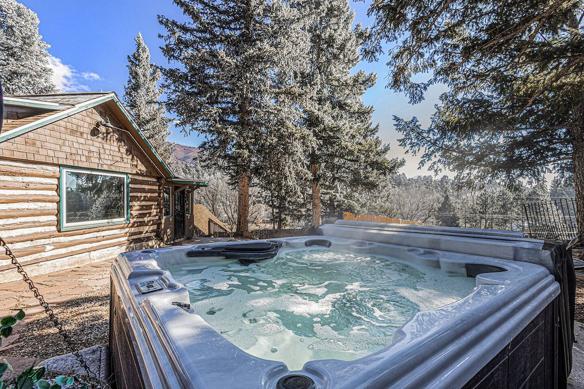 This southwestern boho cabin is tucked amongst the trees in a historic, quiet neighborhood at the foot of famed Pikes Peak. With an ample front deck, floor to ceiling windows, and a private, fenced back yard with hot tub, gas fire pit and s'more fixings waiting for you on arrival, the cabin has wonderful forest and mountain view while within 10 minutes of culture and conveniences in Manitou and Colorado Springs. The place to get away for a romantic retreat, family fun, or a working vacation!