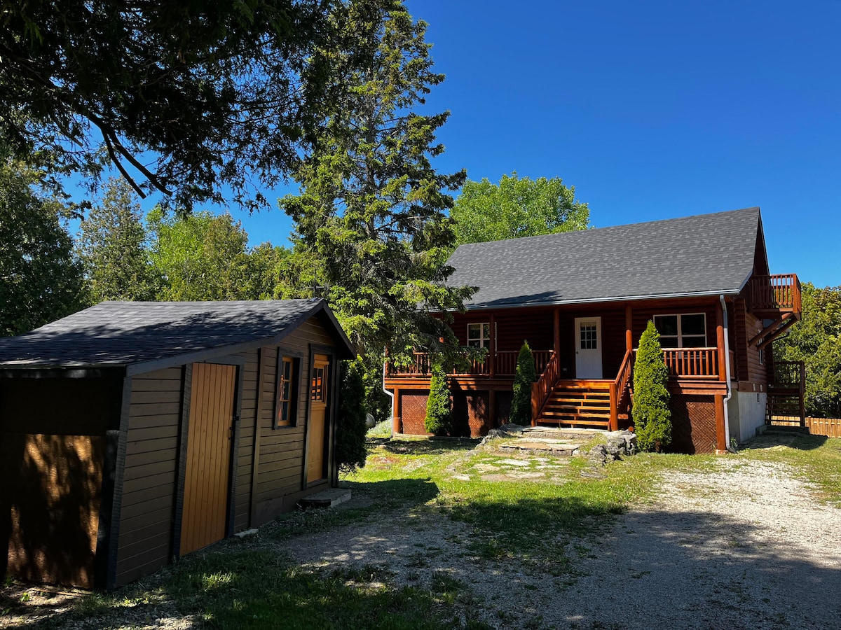 A beautiful log cabin right in Tobermory, walking distance to downtown area, water access points and the visitor centre. This cottage has 2 bedrooms and upstairs loft. View of the water, full kitchen and bathroom, living room and outside seating along with BBQ and Fire pit. Enjoy the ample areas for a glass of wine or morning coffee in the sun room, patio or cozy deck. Free wifi and A/C unit. Outside has badminton net and lots of parking for your group.